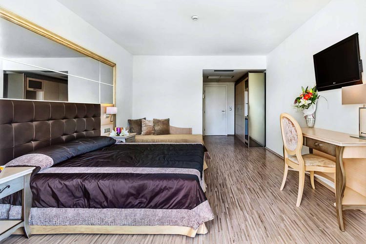 Tipet e dhomave,Approx. size: Double Room 24-27m2; Superior Double Room 24-27m2; Family Room 35-37m2; Family Suite 44m2; Deluxe Suite 60m2.Ne lehtesirat e dhomave perfshihen: banjo me vaske dhe dush, pasqyre per tualetin, tharese flokesh, telefon, TV me ekran te sheshte, mini-bar, ajer i kondicjonuar, system ngrohje individual,kasaforte elektronike ne te gjitha tipet e dhomave.