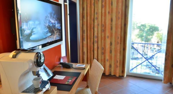Each room comes with a flat-screen TV with satellite channels, extra large bedding and a work desk. They are decorated with bright colours, large windows and a small seating area.