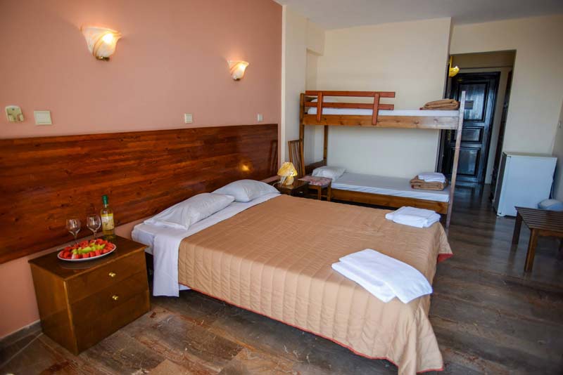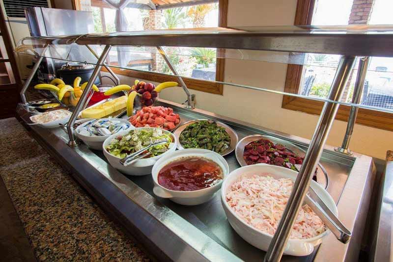 Hoteli disponon pishine te jashme per te rritur dhe femije, te rrethuar me cadra e shezllona, si dhe nje bar buze pishines. Mengjesi sherbehet bude , dhe tavernat sherbejne peshk te fresket dhe ushqim tradicional Grek.