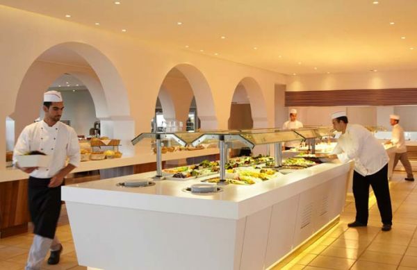 Restoranti me terrace kryesore ofron nje sere specialitetesh me stil "buffet" ndersa restoranti "ujevare" pergatit specialitete te kuzhines Greke.