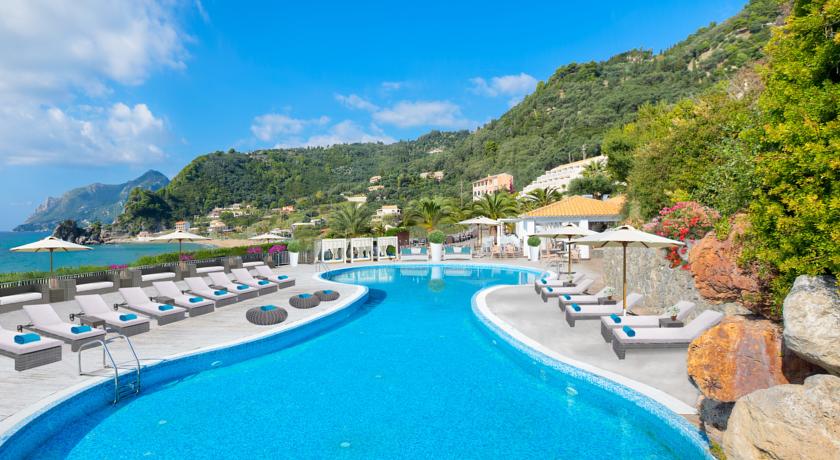 Aquis Pelekas Beach Hotel Corfu, Kontogialos Pelekas.Nje nga gjerat qe e bejne me terheqes kete hotel eshte pikerisht pozicioni i tij pergjate bregdetit.